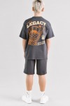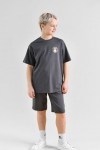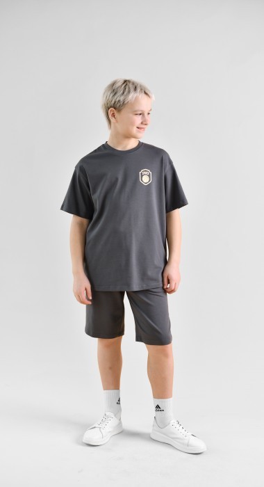 Костюм для мальчика, состоящий из футболки и шорт. Футболка свободная по всей длине, со спущенной линией плеч, с короткими рукавами и горловиной овальной формы, обработанной втачной планкой. По шву втачивания планки выполнена отделочная строчка. Шорты удлиненные, с карманами в боковых швах, на притачном поясе с эластичной тесьмой внутри.