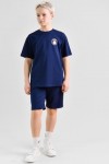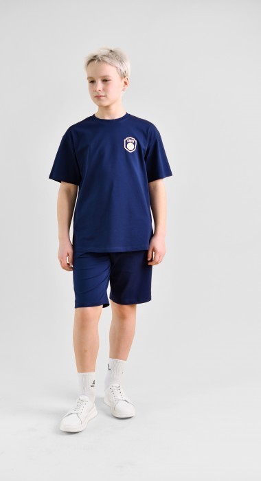 Костюм для мальчика, состоящий из футболки и шорт. Футболка свободная по всей длине, со спущенной линией плеч, с короткими рукавами и горловиной овальной формы, обработанной втачной планкой. По шву втачивания планки выполнена отделочная строчка. Шорты удлиненные, с карманами в боковых швах, на притачном поясе с эластичной тесьмой внутри.