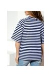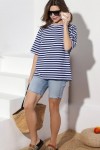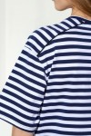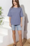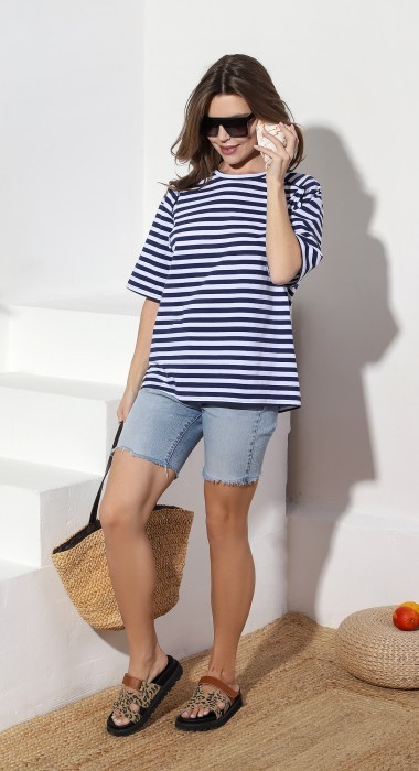 Футболка молодежная их трикотажного полотна кулирка» в полоску, свободная, с втачными рукавами, горловиной овальной формы, обработанной притачной бейкой из основного материала. Полочка и спинка с двумя небольшими косыми кокетками и отделочным кантом в швах соединения кокеток с основными деталями, кант из контрастного материала.