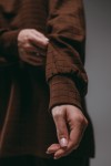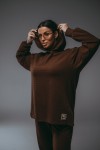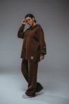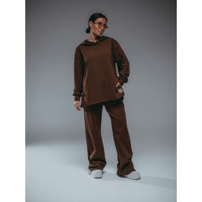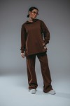 Худи – прямого кроя со спущенной линией плеча, длинным втачным рукавом на манжете. Брюки прямые от бедра с отрезным поясом и карманами.
