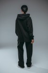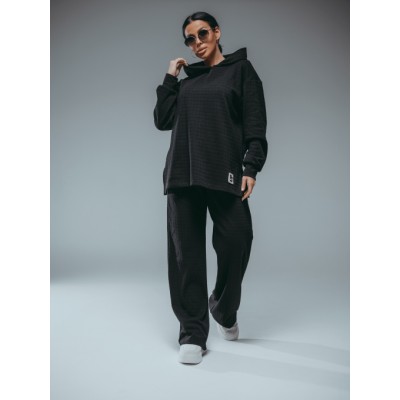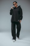 Худи – прямого кроя со спущенной линией плеча, длинным втачным рукавом на манжете. Брюки прямые от бедра с отрезным поясом и карманами.