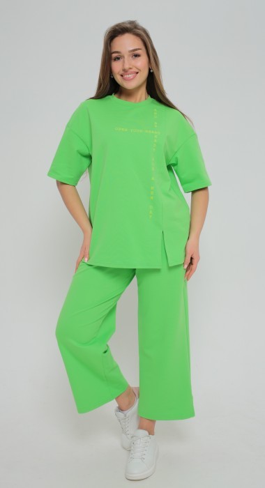 Костюм молодежный из гладкокрашеного трикотажного полотна «футер-двунитка», состоящий из футболки и брюк-кюлотов. Футболка – с короткими втачными рукавами, горловиной овальной формы, обработанной втачной планкой, и принтом на полочке. Полочка – из двух частей, асимметричных относительно центра, и с разрезом в соединительном шве. Брюки-кюлоты – укороченные, широкие, на притачном поясе с эластичной тесьмой внутри, карманами в боковых швах, с широкими отделочными планками по входам и разрезами в боковых швах.