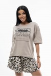 Стильная молодежная пижама с футболкой и юбкой-шортами. Футболка с О-образной горловиной, спущенной линией плеча и печатью спереди. Юбка-шорты имеют трапециевидный крой, выполнены без карманов, на резинке 2см. Костюм сшит из турецкой кулирки, которая отличается мягкостью.