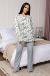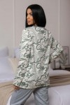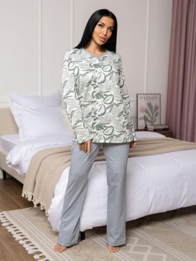 Женская пижама с брюками и лонгом, выполнена из тканей компаньонов, изнанка приятная к телу, с небольним начесом. Лонг с кокеткой на запах и фактурной отстрочкой по горловине, рукаву и низу. Брюки с мягкой резинкой, комфортной для сна и отдыха.