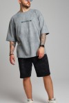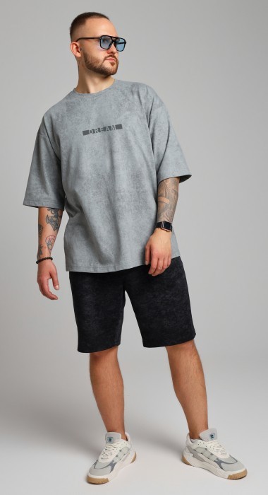 Футболка мужская из трикотажного полотна "кулирка-варенка", с удлиненными плечевыми швами, втачными короткими рукавами, горловиной овальной формы, обработанной втачной планкой, и принтом на детали переда, выполненным в технике шелкографии. По горловине изделия настрочена отделочная строчка.