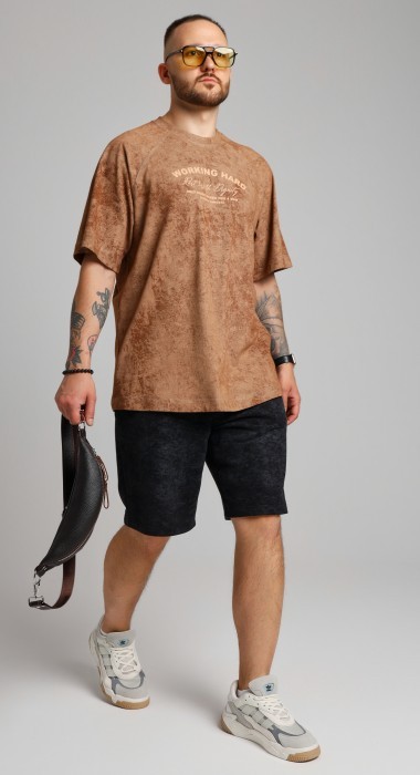 Футболка мужская из трикотажного полотна "кулирка-варенка", с удлиненными плечевыми швами, втачными короткими рукавами, горловиной овальной формы, обработанной втачной планкой, и принтом на детали переда, выполненным в технике шелкографии. По горловине изделия настрочена отделочная строчка.