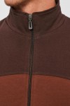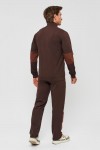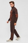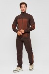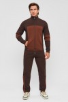 Мужской спортивный костюм из хлопкового трикотажа. В комплекте костюма куртка на манжетах и свободные прямые брюки. Воротник куртки - стойка, полочка и рукава выполнены оригинальным образом комбинацией тканей, застёжка на молнии. Куртка и брюки с удобными карманами. Брюки на поясной резинке, выполнены из однотонного цвета. Модель костюма свободного покроя, не сковывает движений. Такой костюм прекрасно подойдёт как для спорта, так и для отдыха.