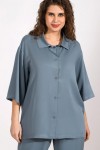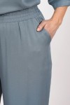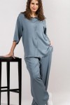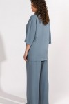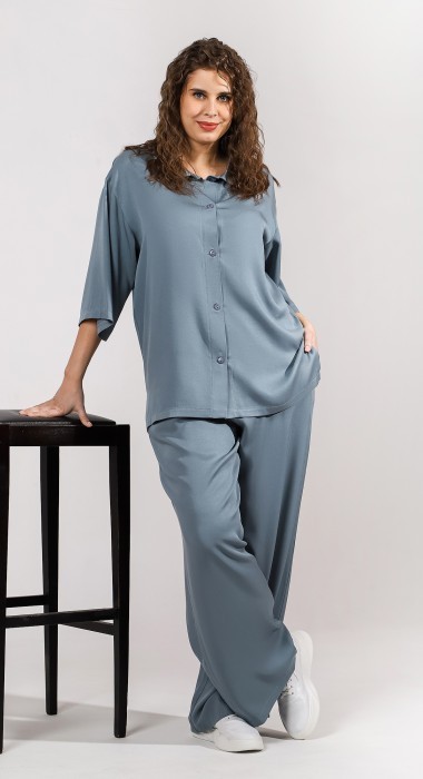 Костюм женский из гладкокрашеного тканого полотна «штапель» состоящий из блузы и брюк в единой цветовой гамме. Блуза (рубашка) женская из тканого гладкокрашеного полотна «штапель», свободного покроя, с короткими втачными рукавами, стояче-отложным воротником, центральной бортовой застежкой на обметанные петли и пуговицы. В боковых швах разрезы. Брюки женские из гладкокрашеного тканого полотна «штапель», свободные слегка расширенные книзу, с карманами в боковых швах на притачном поясе с эластичной тесьмой внутри.